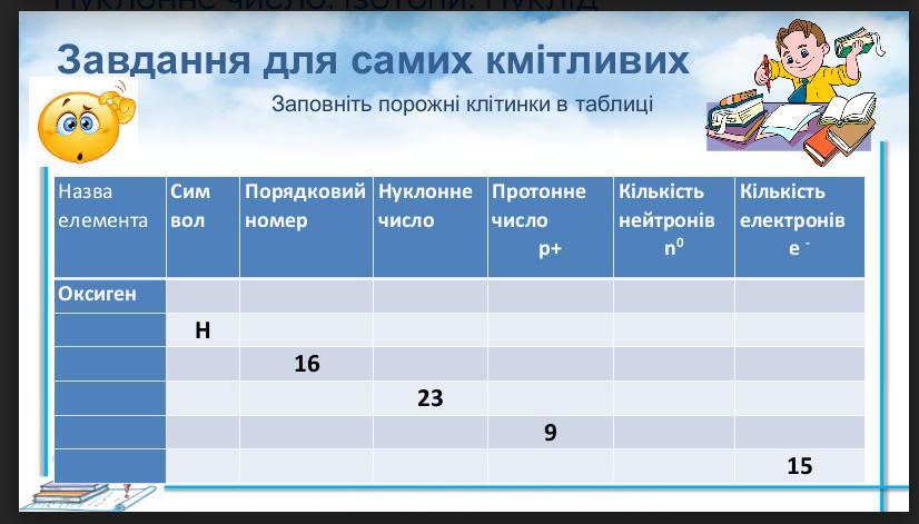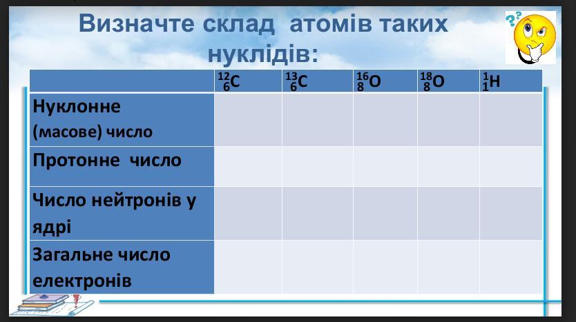 Заполните 2 таблицы по Химии, очень нужна помощь, тема: Будова атома. Склад атомних ядер (протони і нейтрони). Протонне число. Нуклонне число. Ізотопи. Нуклід.