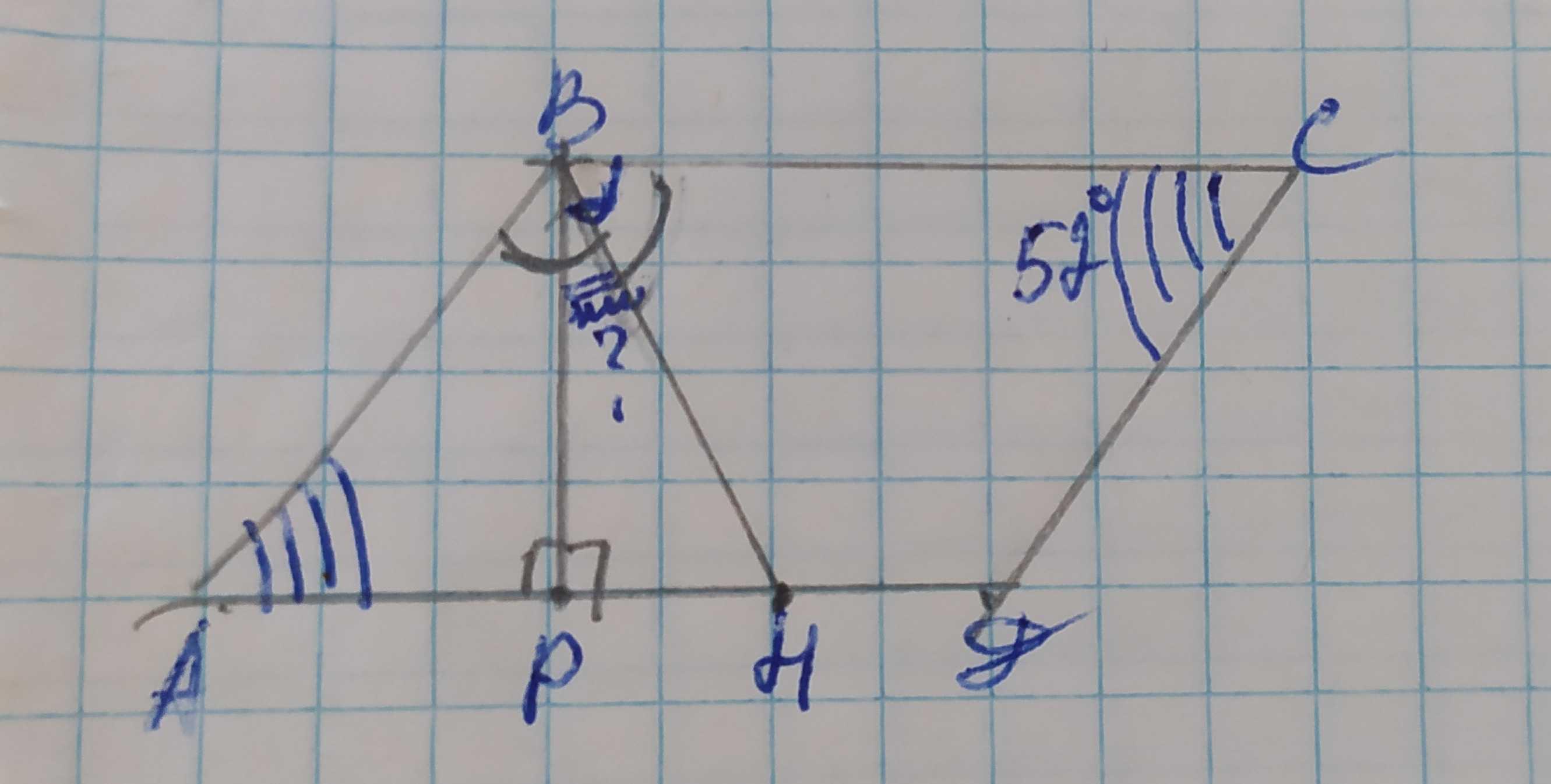 В паралелограммі АВСД з тупого кута В проведена висота ВР і бісектриса ВН.Знайдіть кут РВН,якщо кут С ,дорівнює 52°.
