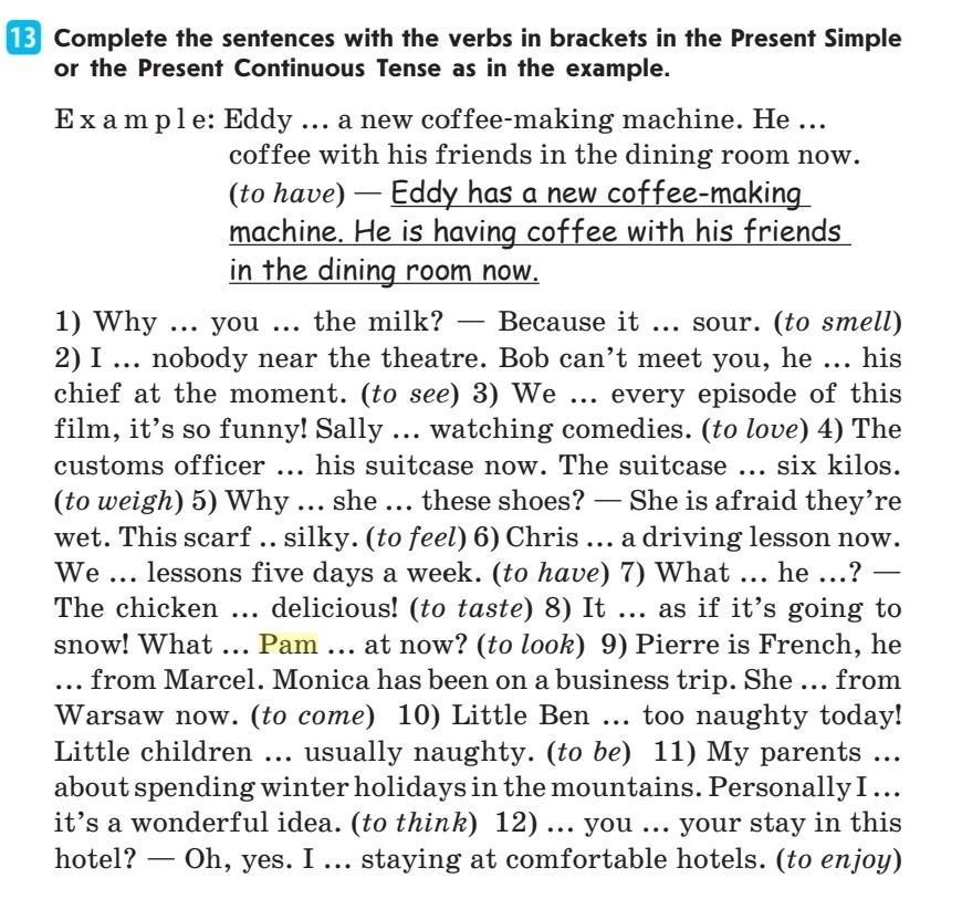 13 Complete the sentences with the verbs in brackets in the Present Simple or the Present Continuous Tense as in the example. Example: Eddy ... a new coffee-making machine. He ... coffee with his friends in the dining room now. (to have) - Eddy has a new coffee-making machine. He is having coffee with his friends in the dining room now. 1) Why ... you the milk? Because it ... sour. (to smell) 2) I ... nobody near the theatre. Bob can't meet you, he ... his chief at the moment. (to see) 3) We every episode of this film, it's so funny! Sally ... watching comedies. (to love) 4) The customs officer ... his suitcase now. The suitcase ... six kilos. (to weigh) 5) Why ... she ... these shoes? - She is afraid they're wet. This scarf .. silky. (to feel) 6) Chris ... a driving lesson now. We lessons five days a week. (to have) 7) What ... he ...? - The chicken delicious! (to taste) 8) It... as if it's going to snow! What... Pam ... at now? (to look) 9) Pierre is French, he ... from Marcel. Monica has been on a business trip. She ... from Warsaw now. (to come) 10) Little Ben ... too naughty today! Little children ... usually naughty. (to be) 11) My parents ... about spending winter holidays in the mountains. Personally I….. it's a wonderful idea. (to think) 12)... you ... your stay in this hotel? Oh, yes. I ... staying at comfortable hotels. (to enjoy) ... — ...
