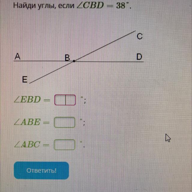 По теореме угол АВЕ = углу CBD и равен 38. Угол EBD является смежным и находится по формуле 180 - 38 = 142. По тому же принципу находится угол ABC