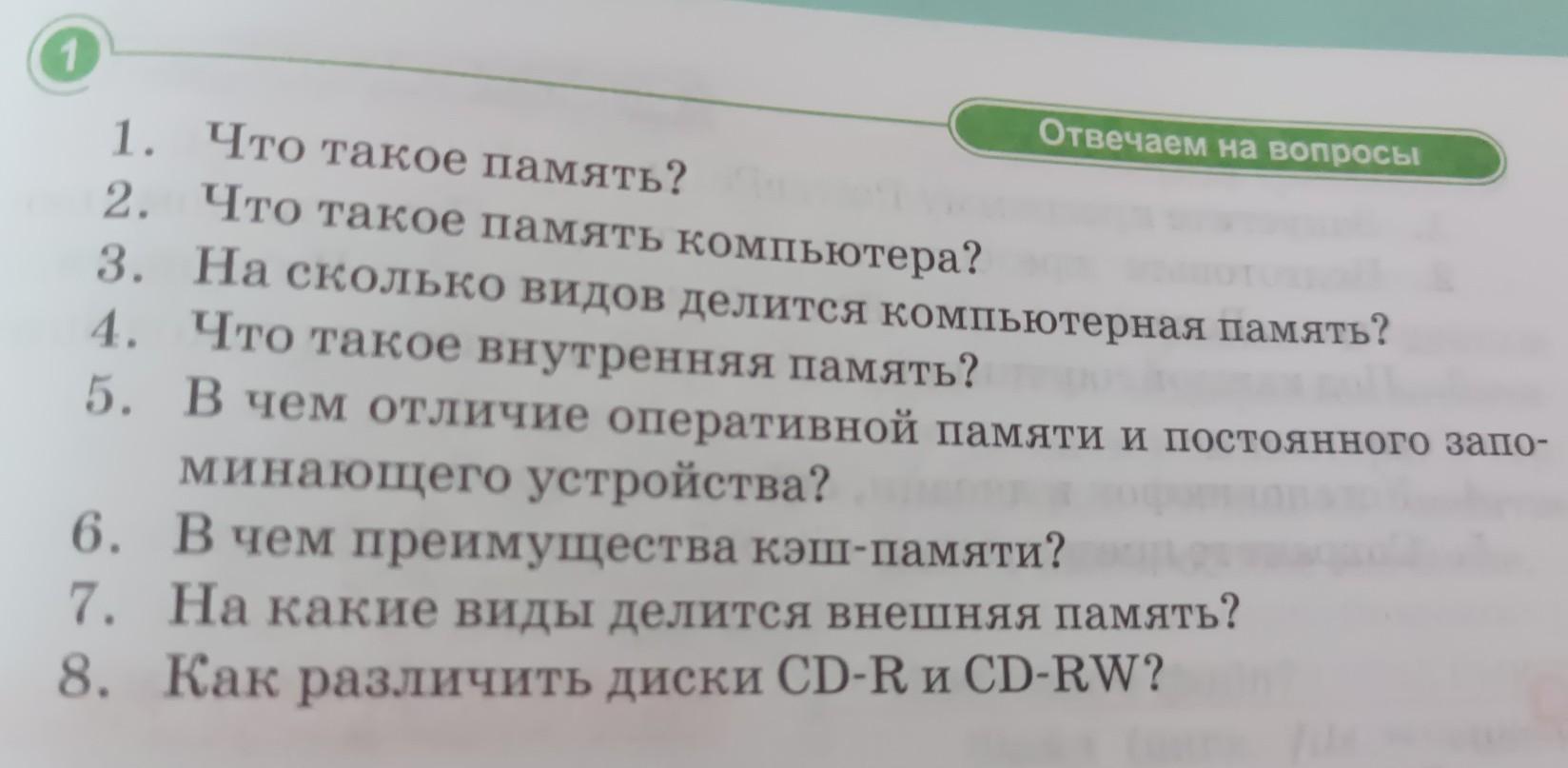1 Отвечаем на вопросы 1. Что такое память? 2. Что такое память компьютера? 3. На сколько видов делится компьютерная память? 4. Что такое внутренняя память? 5. В чем отличие оперативной памяти и постоянного запо- минающего устройства? 6. В чем преимущества кэш-памяти, 7. На какие виды делится внешняя память? 8. Как различить диски CD-R и CD-RW?