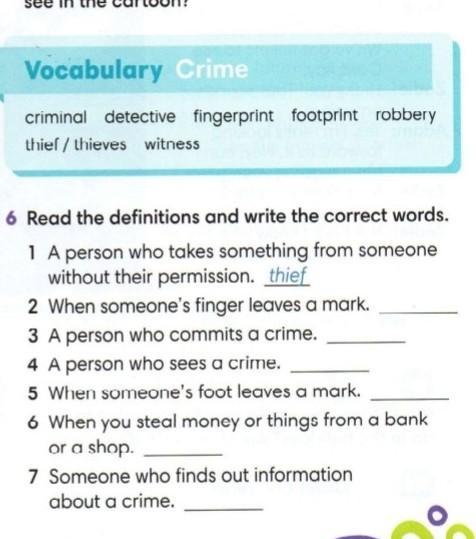 Vocabulary Crime criminal detective fingerprint footprint robbery thief / thieves witness 6 Read the definitions and write the correct words. 1 A person who takes something from someone without their permission. thief 2 When someone's finger leaves a mark. 3 A person who commits a crime. 4 A person who sees a crime. 5 When someone's foot leaves a mark. 6 When you steal money or things from a bank or a shop. 7 Someone who finds out information. about a crime.