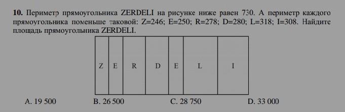 Периметр прямоугольника ZERDELI на рисунке ниже равен 730. А периметр каждого прямоугольника поменьше таковой: Z=246; E=250; R=278; D=280; L=318; I=308. Найдите площадь прямоугольника ZERDELI. A. 19 500 B. 26 500 C. 28 750 D. 33 000 (дам 30 баллов)