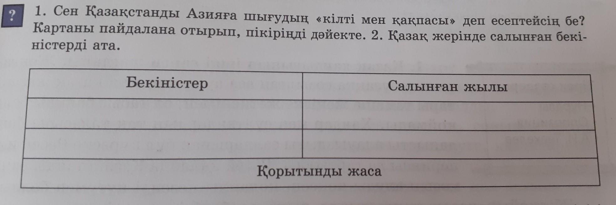 ? 1. Сен Қазақстанды Азияға шығудың «кілті мен қақпасы» деп есептейсің бе? Картаны пайдалана отырып, пікіріңді дәйекте. 2. Қазақ жерінде салынған бекi- ністерді ата. Бекіністер Қорытынды жаса Салынған жылы