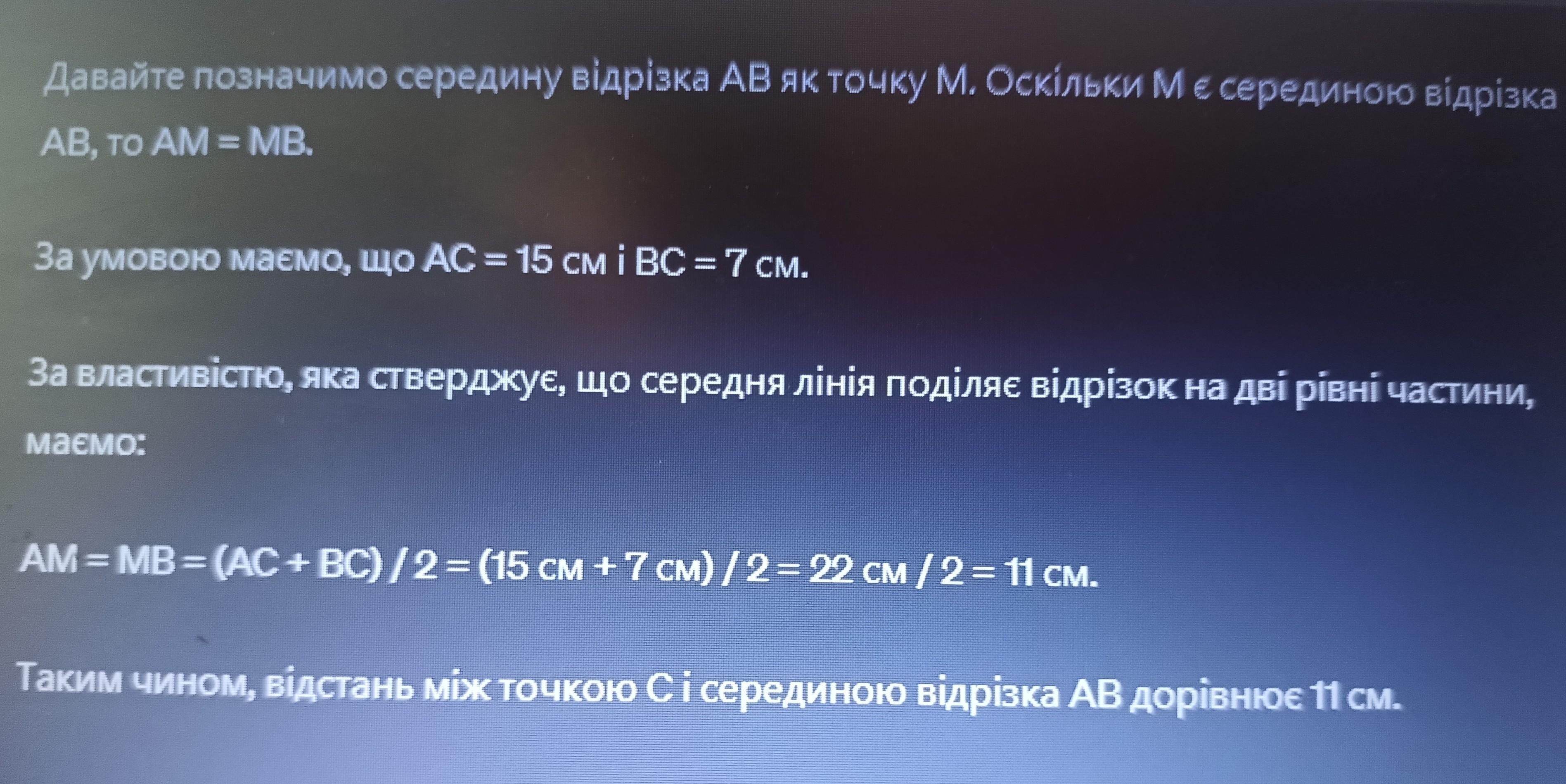 Точка С належить відрізку АВ. Чому дорівнює відстань між точкою С і серединою відрізка АВ, якщо АС = 15 см, ВС = 7 см?