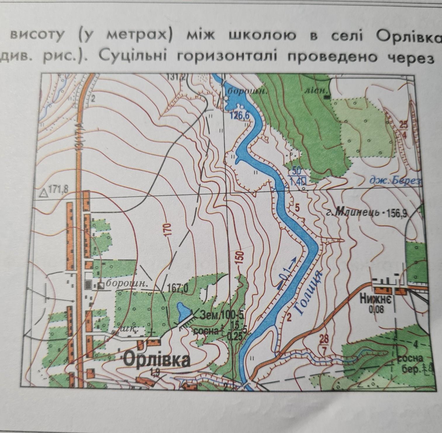 2. Визнач відносну висоту (у метрах) між школою в селі Орлівка та водяним млином на річці Голиця (див. рис.). Суцільні горизонталі проведено через 5 м.