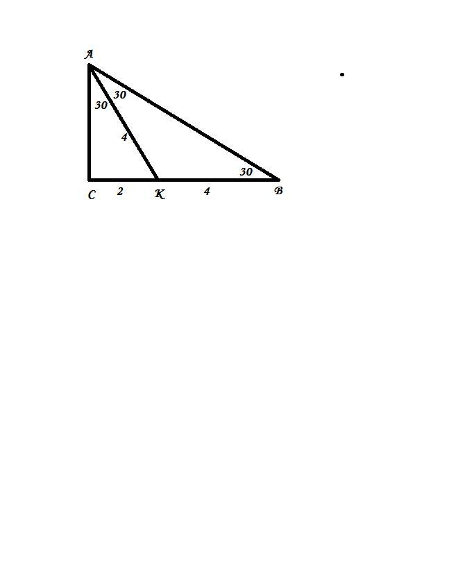 Дано: ΔАВС, ∠С=90°, ∠А=60°; АК - бісектриса, АК=4 см. ВС - ?