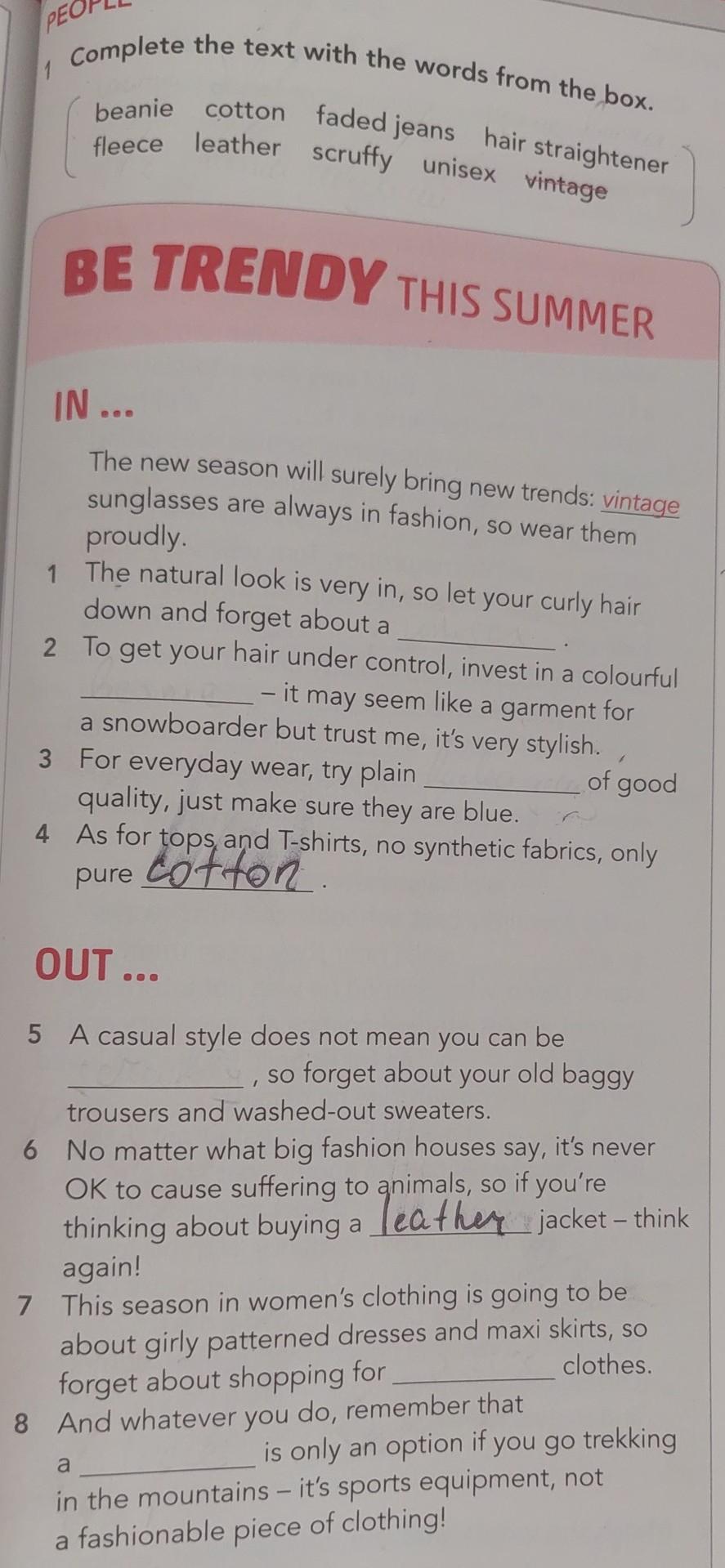 Complete the text with the words from the box. beanie cotton faded jeans hair straightener fleece leather scruffy unisex vintage