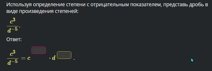 Если отрицательный показатель находится в знаменателе, нужно переместить его в числитель и сделать показатель положительным.