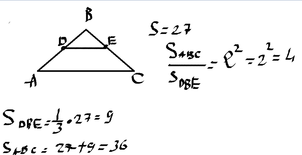 точка Д -середина стороны АВ треугольника АВС, точка Е - середина стороны ВС .Площадь четырехугольника АДЕС равна 27 см ^2.Чему равна площадь треугольника АВС?