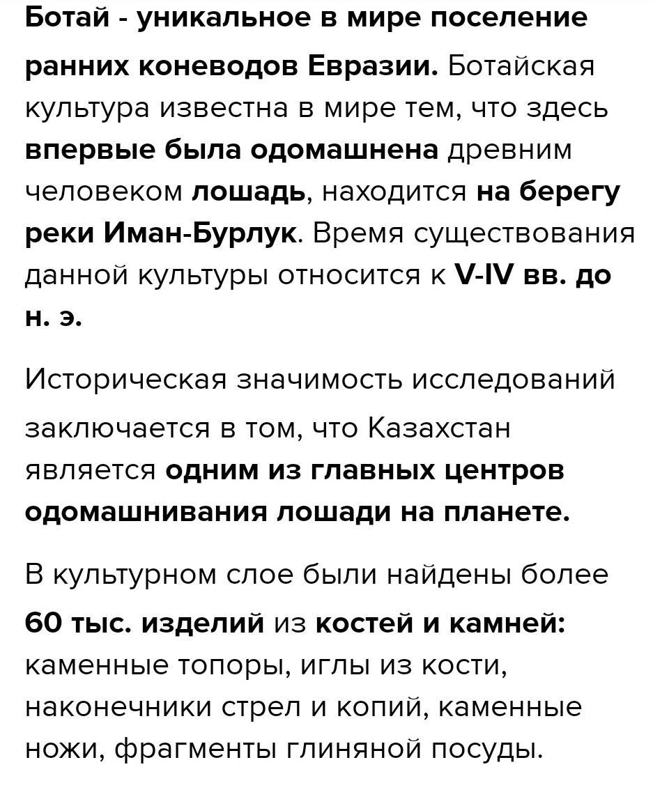 1. Дайте определение эпохе энеолита. 2. Охарактеризуйте ботайскую культуру. Как вы думаете, в чем ее особенность. 3. Расскажите, что вы знаете о переселении индоиранских пле- мен. Какие культуры получили распространение на террито- рии Казахстана? 4. Заполните таблицу «Культуры эпохи энеолита». Название Хронологические культуры рамки Территория распространения Особенности