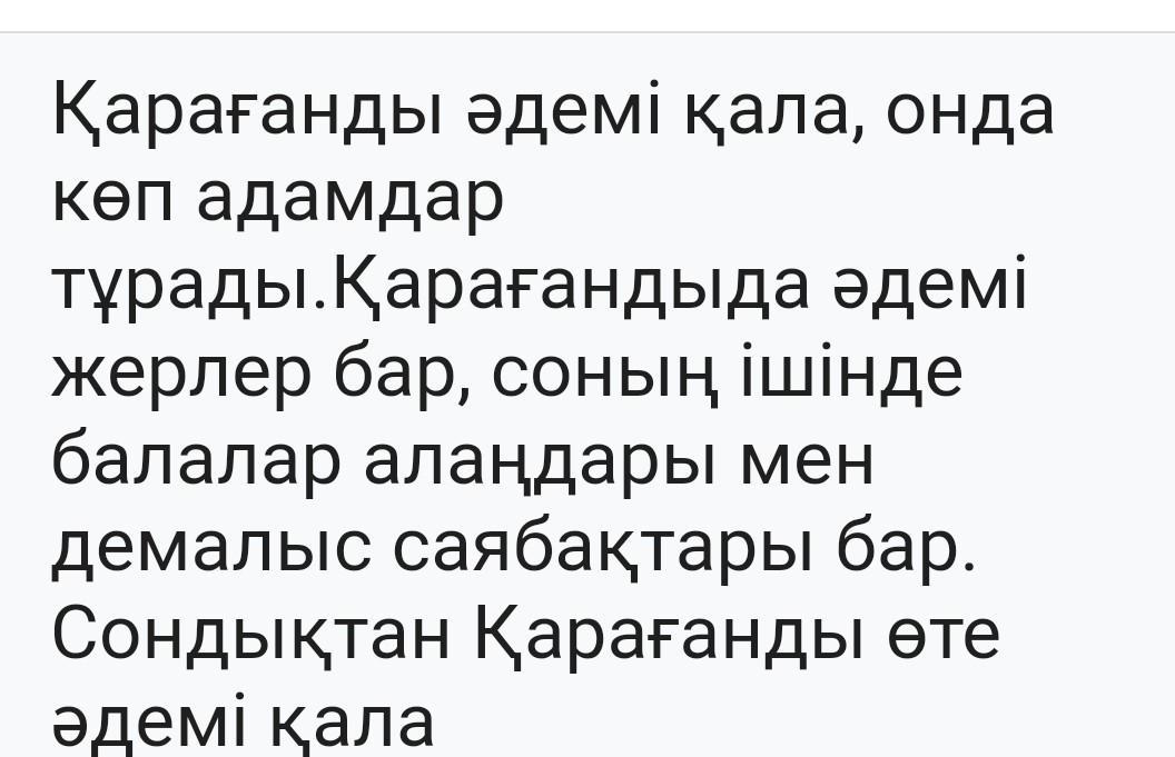 Қарағанды әдемі қала, онда көп адамдар тұрады.Қарағандыда әдемі жерлер бар, соның ішінде балалар алаңдары мен демалыс саябақтары бар. Сондықтан Қарағанды өте әдемі қала