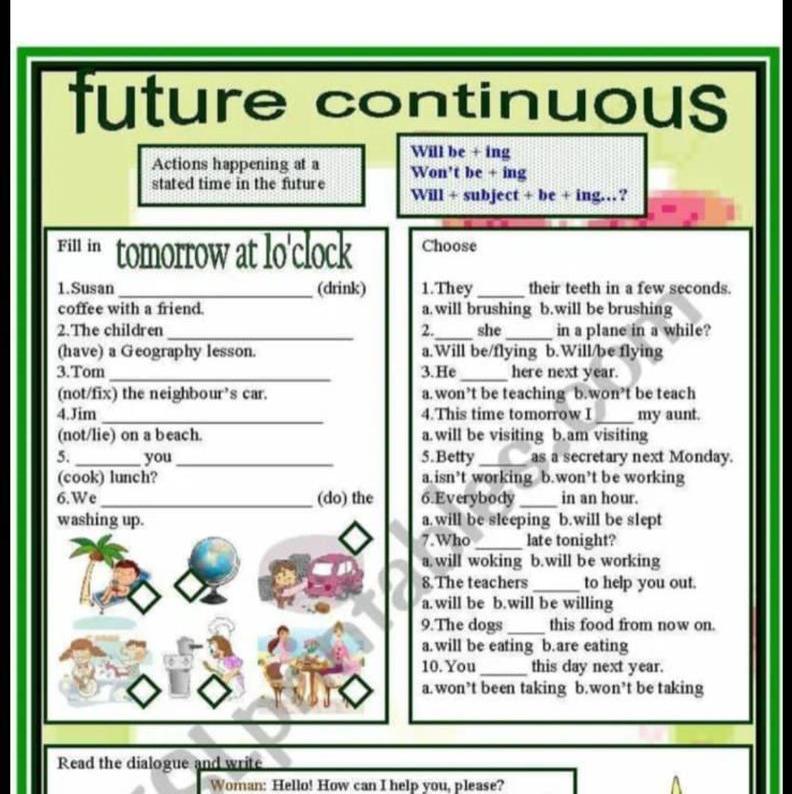 5. Betty b) won't be working as a secretary next Monday. 6. Everybody a) will be sleeping in an hour. 7. Who b) will be working late tonight? 8. The teachers b) will be willing to help you out. 9. The dogs a) will be eating this food from now on. 10. You b) won't be taking this day next year.