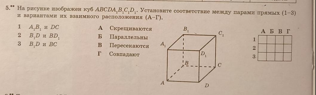 3. ВС лежит в плоскости нижнего основания куба, а В₁Д пересекает эту плоскость нижнего основания ( в точке Д), значит они не могут лежать в одной плоскости, что является признаком скрещивающихся прямых, то есть, ВС и В₁Д являются скрещивающимися прямыми. Ответ 3А.