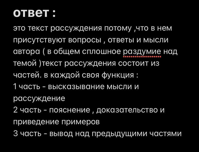 Помогите ПОЖАЛУЙСТА ООЧЕНЬ СРОЧНО!!!!! ДОКАЖИТЕ ЧТО ЭТО ТЕКСТ РАССУЖДЕНИЕ И НАЗОВИТЕ ЕГО СТРУКТУРНЫЕ ЧАСТИ!!!!! Даю 20 баллов!!!!