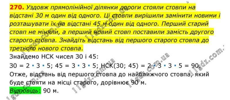 270. Уздовж прямолінійної ділянки дороги стояли стовпи на відстані 30 м один від одного. Ці стовпи виріши- ли замінити новими і розташувати їх на відстані 45 м один від одного. Перший старий стовп не міняли, а перший новий стовп поставили замість другого старо- го стовпа. Знайдіть відстань від першого старого стов- па до третього нового стовпа?