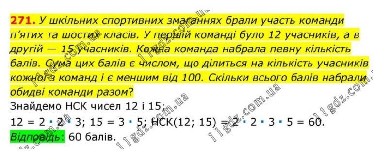 271. У шкільних спортивних змаганнях брали участь ко- манди п’ятих та шостих класів. У першій команді було 12 учасників, а в другій 15 учасників. Кожна команда набрала певну кількість балів. Сума цих ба- лів є числом, що ділиться на кількість учасників кож- ної з команд і є меншим від 100. Скільки всього балів набрали обидві команди разом?