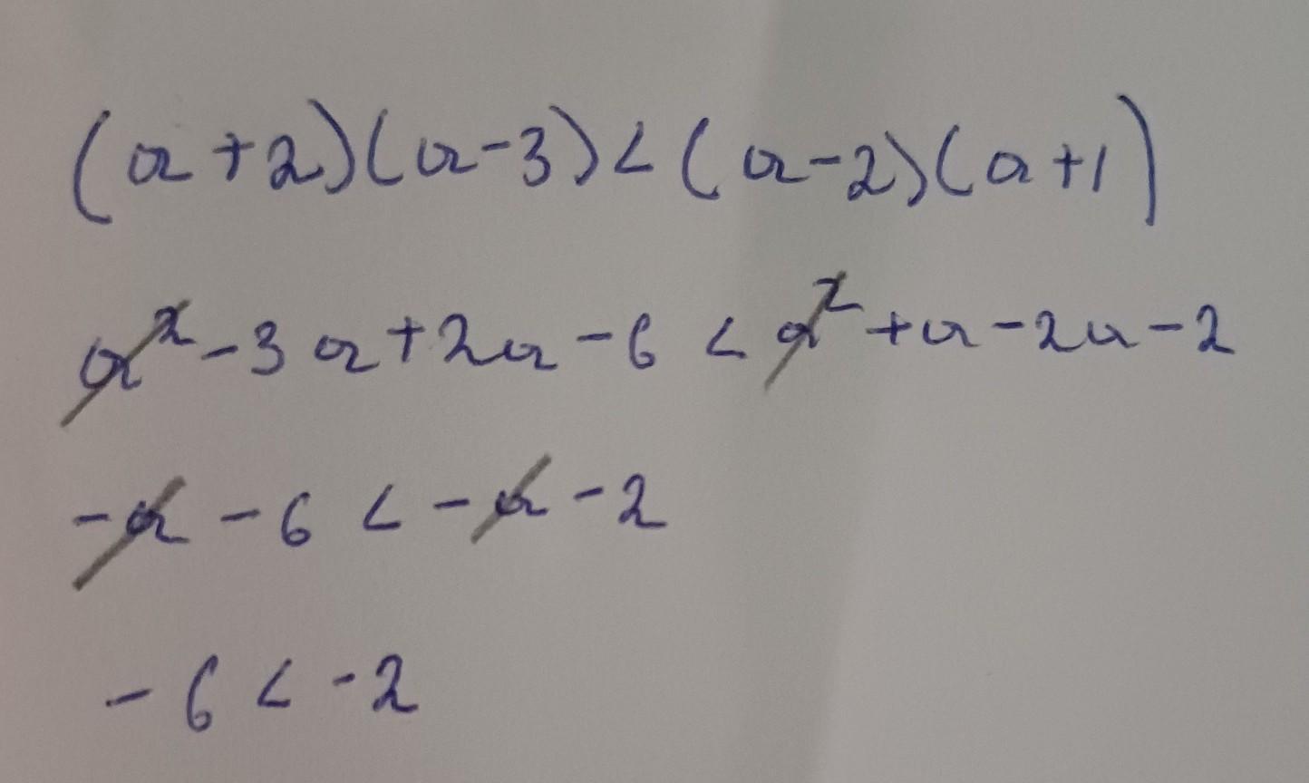 Оскільки в першому випадку a не може бути одночасно менше 4 і більше -1, а в другому випадку немає жодного значення a, що виконує обидві нерівності, то вихідна нерівність a + 2(a - 3) < (a - 2)(a + 1) справедлива для всіх значень a.