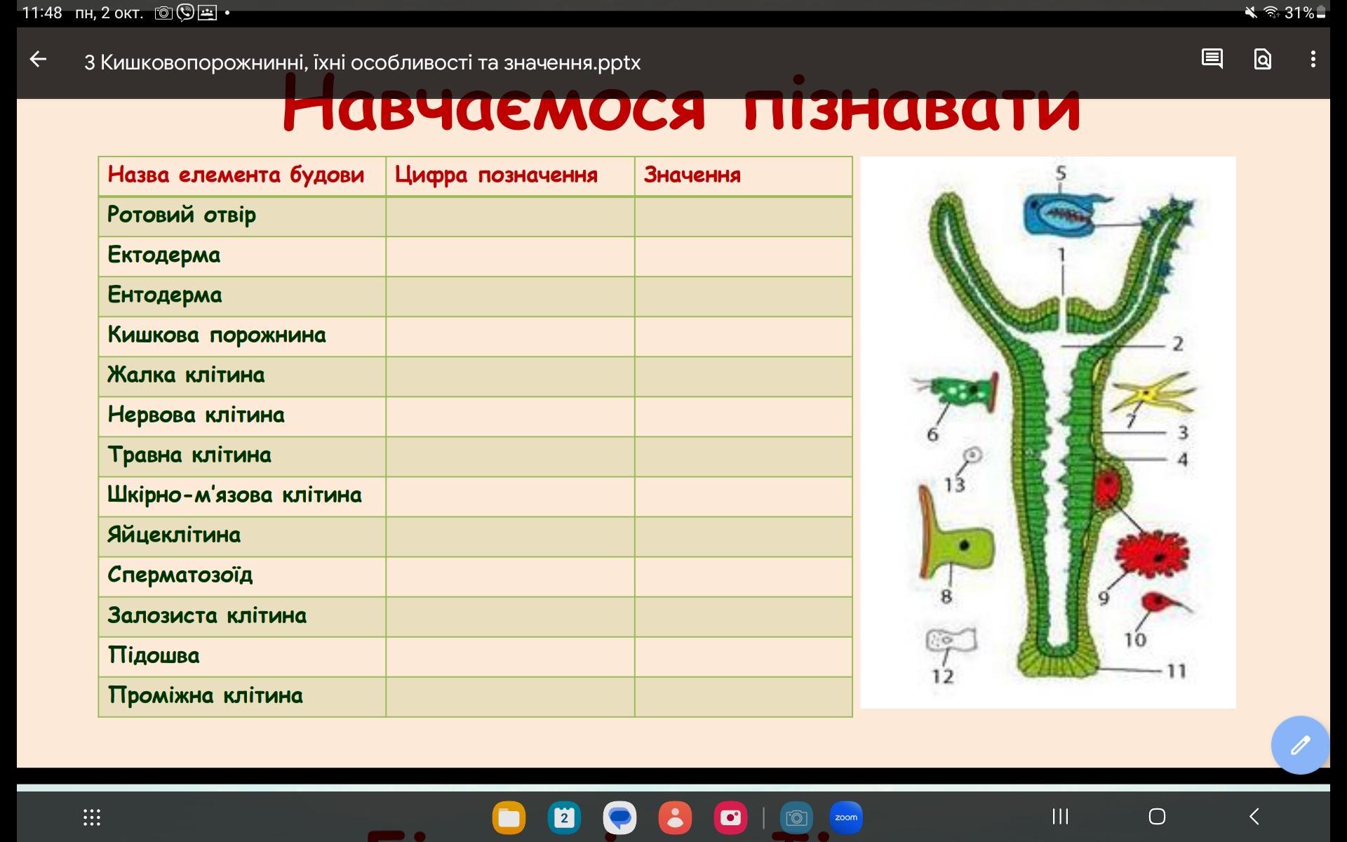 ротовий отвір: 1 захоплює їжу ектодерма: 3 зовнішній шар клітин (покриває гідру) ентодерма: 4 внутрішній шар клітин (виконує функцію внутрішнього травлення) кишкова порожнина: 2 їжа проникає в неї через ротовий отвір Стрічка клітина: 5 мають капсулу з отруйною речовиною, вражає жертву Нервова клітина: 7 функція нервової системи сприймає різні подразнення Травна клітина: 6 виділяють сік, що перетравлює їжу Шкіро-м'язова клітина: 8 утворює основну масу тіла гідри та сприяє руху Яйцеклітина: 9 виконує функцію