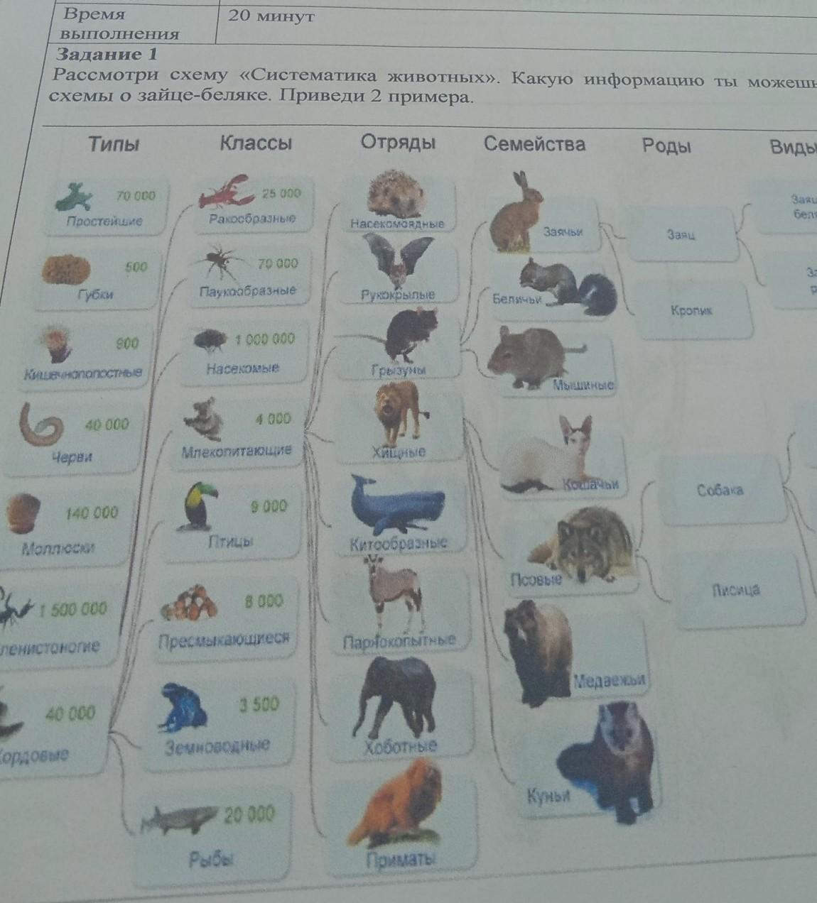 выков Время · выполнения Задание 1 Рассмотри схему «Систематика животных». Какую информацию ты можешь получить из этой схемы о зайце-беляке. Приведи 2 примера. Типы Отряды Простейшие Губки вчнополостные Черви Onnoc 70 000 40 000 140 000 1 500 000 стологие 500 900 40 000 20 минут Классы Ракообразные 25 000 70 000 Паукообразные 1 000 000 Насекомые Млекопитающие Птицы 4.000 3 000 Рыбы 8 000 Пресмыкающиеся 3 500 Земноводные 20 000 Насекомоядные Рукокрылые Грь зуны Хищные Китообразные Парнокопытные Хоботные Приматы Семейства Бели би Заячьи Мышиные Псовые Кошачьи Куньи Медвежьи Роды Заяц Кропик Собака Писица Виды Заяц беляк Заяц- pycax Bonk Wakan Песец