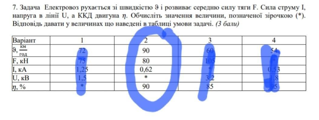 7. Електровоз рухається зі швидкістю 9 і розвиває середню силу тяги F. Сила струму 1. напруга в лінії , а ККД двигуна пл. Обчисліть значення величини, позначеної зірочкою (*).