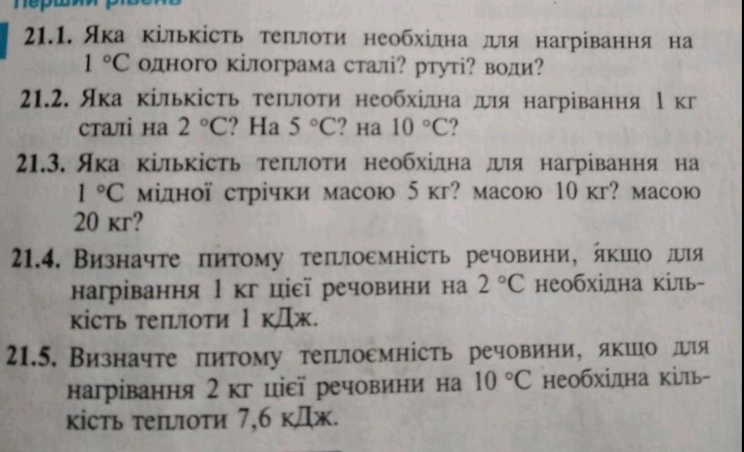 Даю 50 бал. 21.1. Яка кількість теплоти необхідна для нагрівання на 1 °C одного кілограма сталi? ртутi? води? 21.2. Яка кiлькiсть теплоти необхідна для нагрівання 1 кг сталi на 2 °С? На 5 °C? на 10 °C? 21.3. Яка кількість теплоти необхідна для нагрівання на 1 °C мiдної стрічки масою 5 кг? масою 10 кг? масою 20 кг? 21.4. Визначте питому теплоємність речовини, якщо для нагрівання 1 кг цієї речовини на 2 °С необхідна кiль- кiсть теплоти 1 кДж. 21.5. Визначте питому теплоємність речовини, якщо для нагрівання 2 кг цієї речовини на 10 °С необхідна кiль- кiсть теплоти 7,6 кДж.