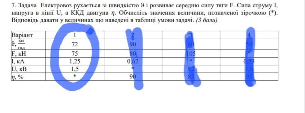 7. Електровоз рухається зі швидкістю 9 і розвиває середню силу тяги F. Сила струму 1. напруга в лінії , а ККД двигуна пл. Обчисліть значення величини, позначеної зірочкою (*).