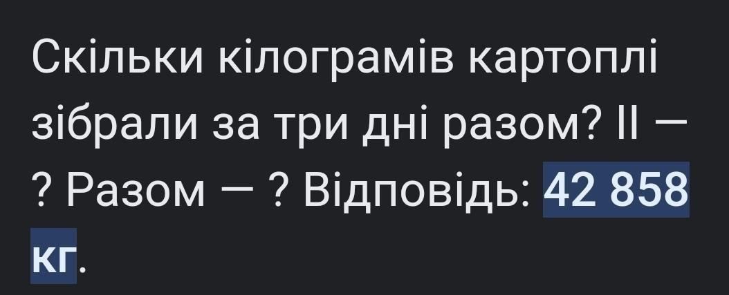217. Першого дня у фермерському господарстві зібрали 13 223 кг картоплі, що на 1231 кг менше, ніж другого дня. Третього дня зібрали на 727 кг картоплі більше. ніж другого дня. Скільки кілограмів картоплі зібралі за три дні разом?