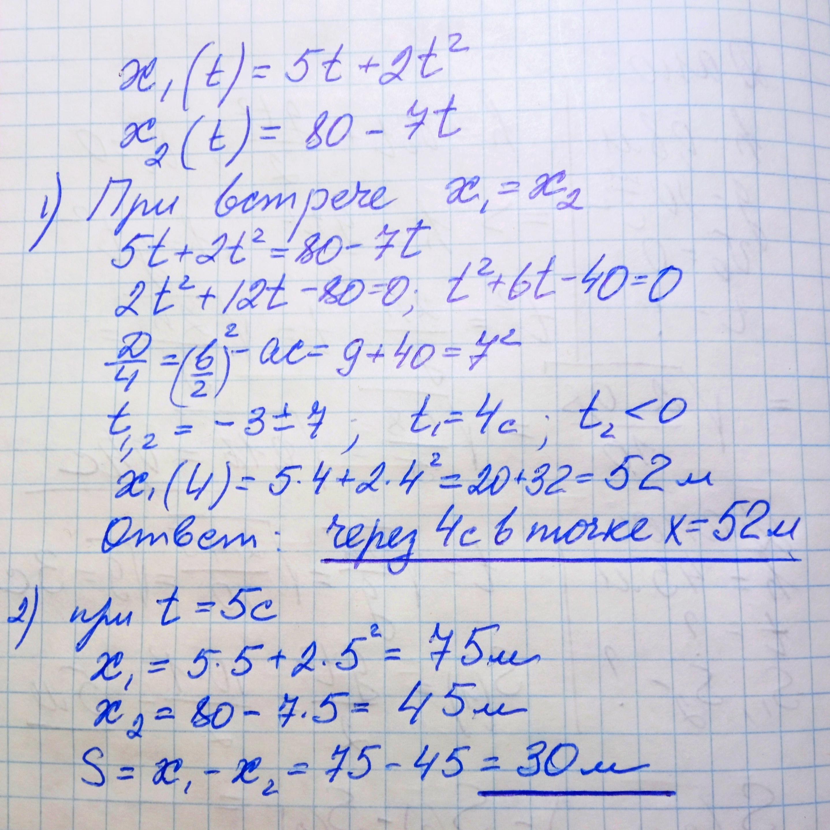 Рухи двох автомобілів описуються рівнянням: х1=5t+2t² x2=80-7t Визначте де і коли вони зустрінуться; відстань між автомобілями п'ять секунд після початку руху. Розв'язати задачу аналітично і графічно.
