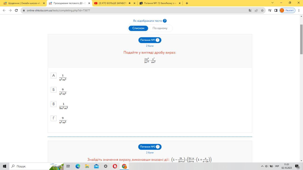 подайте у вигляді дробу вираз 2m2\3n12 (помножити) n7\6m5