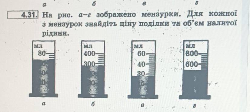 4.31. На рис. а-г зображено мензурки. Для кожної з мензурок знайдіть ціну поділки та об'єм налитої рідини.