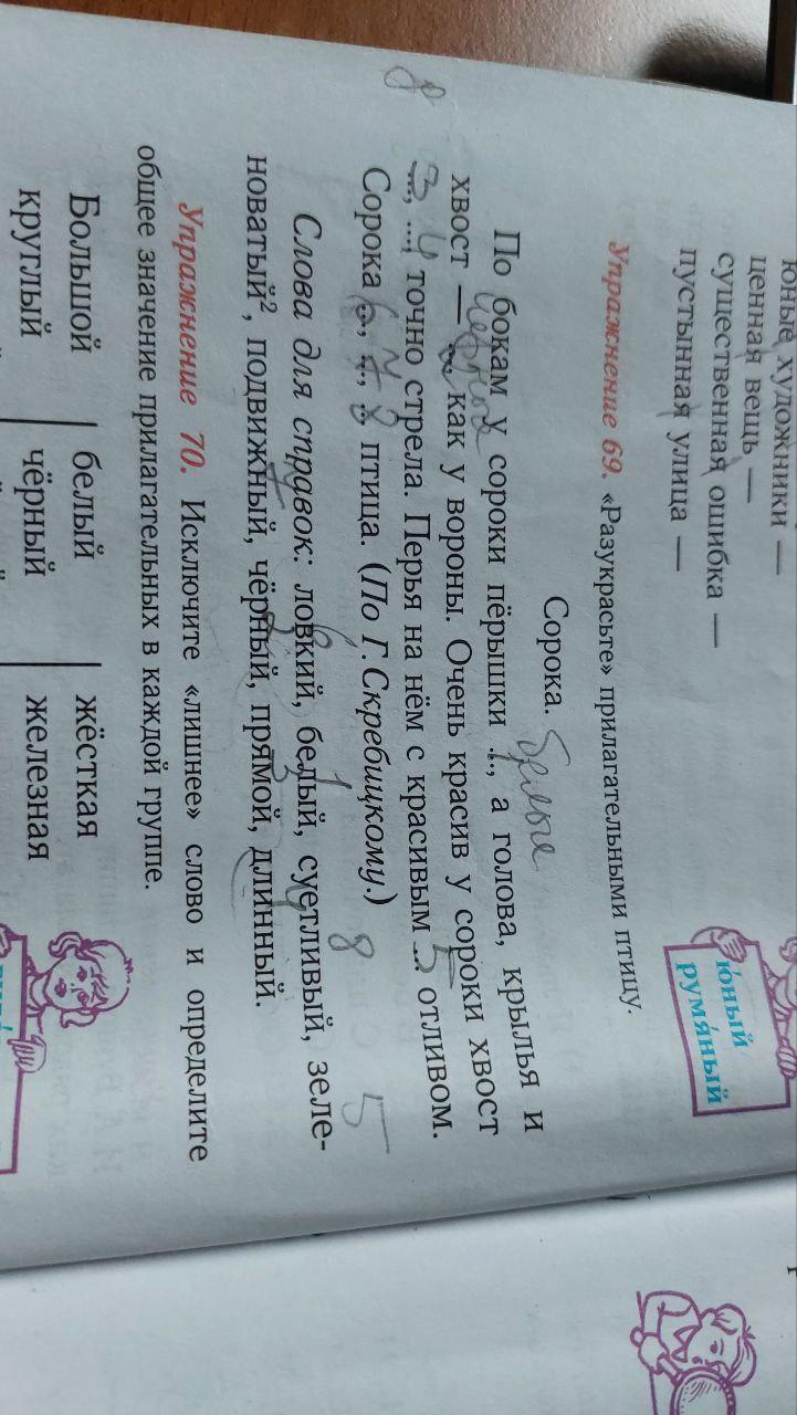 По бокам у сороки перышки белые, а голова, крылья и хвост—чёрные как у вороны. Очень красив у сороки хвост длинный, прямой, точно стрела. Перья на нем с красивым зеленоватым отливом. Сорока ловкая, суетливая, подвижная птица.