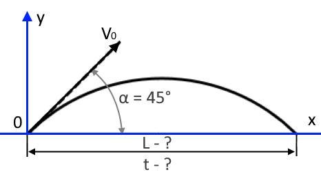 Шарик бросили под углом 45° к горизонту со скоростью 10 м/с. Через какое время он упадет? Какова будет дальность полета?