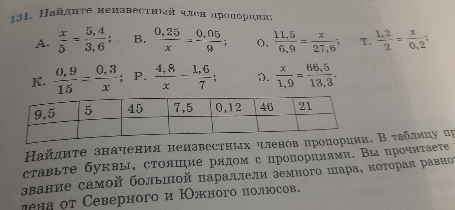 Найдите значения неизвестных членов пропорции. В таблицу про- ставьте буквы, стоящие рядом с пропорциями. Вы прочитаете на- звание самой большой параллели земного шара, которая равноуда- лена от Северного и Южного полюсов.
