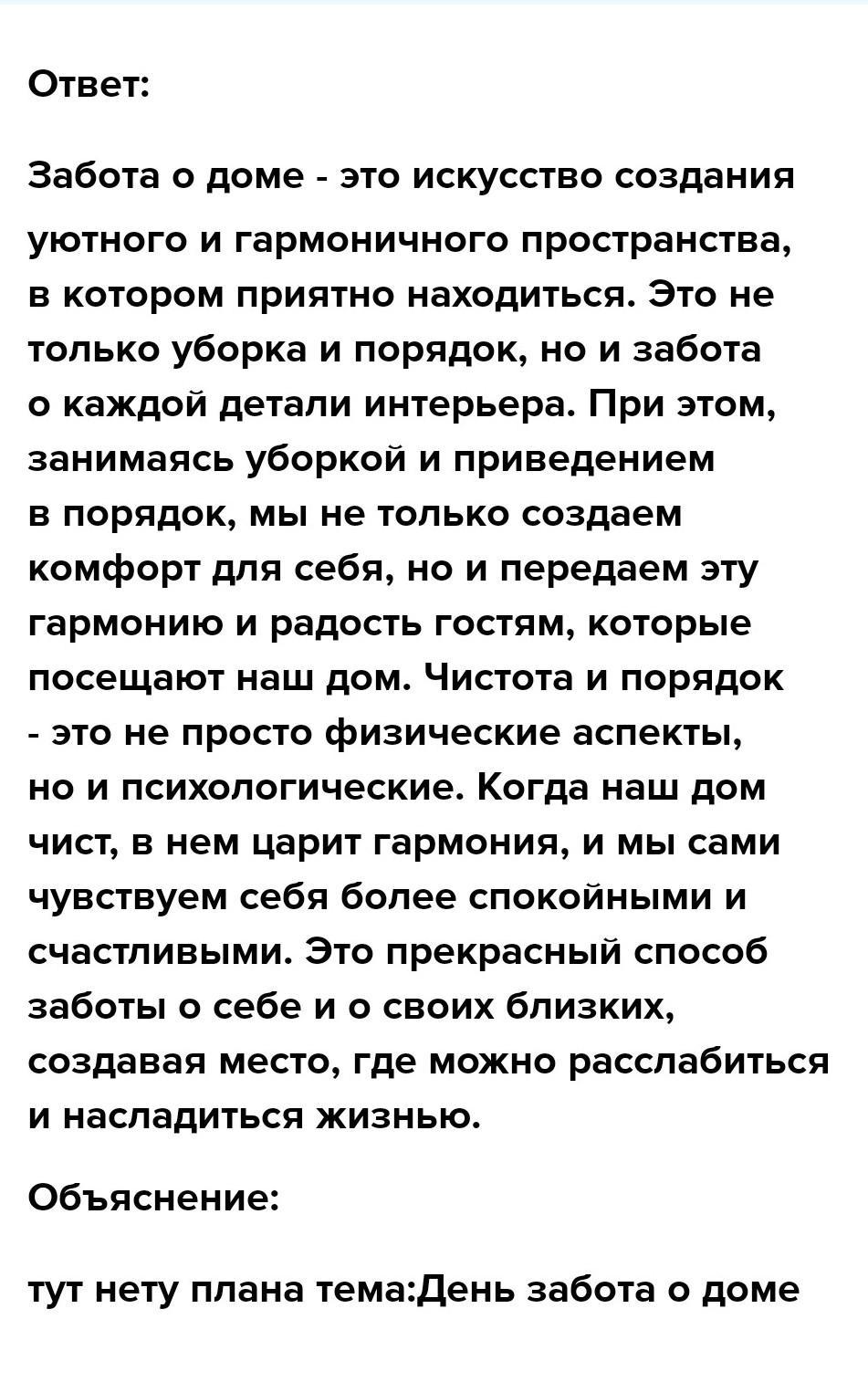 Задание 3. 8 баллов Составьте план текста на одну из приведенных тем. Сформулируйте основную мысль для каждой темы. Напишите текст-описание с элементами рассуждения (А) 1. Моя семья - самое большое богатство. 2. Родной дом - нет места лучше. или текст-повествование с элементами описания (Б). 1.День в заботе о доме. 2. В каждой семье свой порядок. (100 слов)