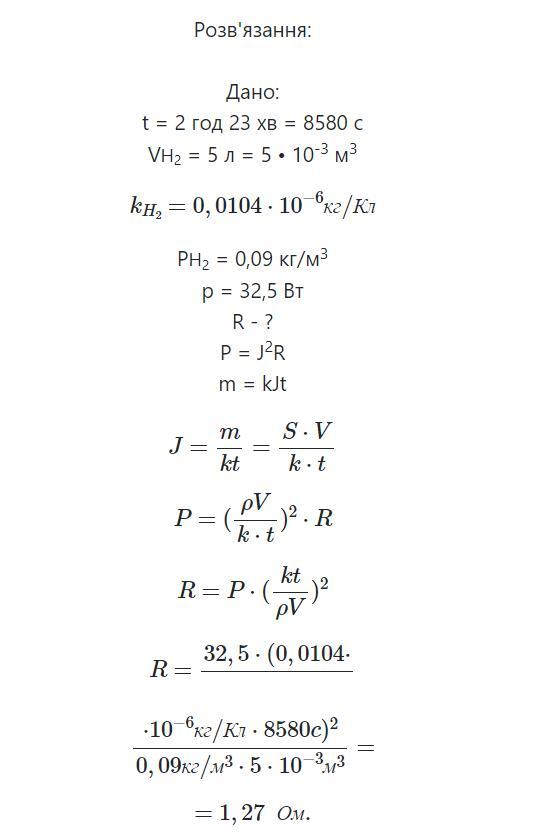Під час електролізу розчину сірчаної кислоти за 2 год 23 хв виділяється 5 л водню за нормальних умов. Визначте опір розчину, якщо потужність струму дорівнює 32,5 Вт
