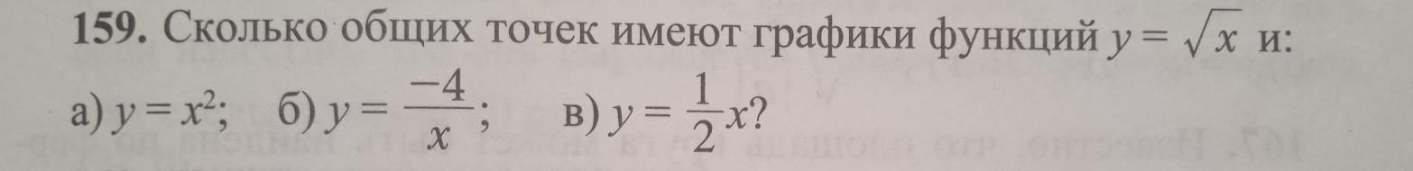 159. Сколько общих точек имеют графики функций у = √x и: x a) y = x²; 6) y = -4. X 1 - B) y = =-x? 2