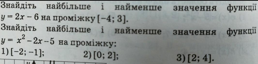 Знайдіть найбільше і найменше у = 2х - 6 на проміжку[-4; 3]. Знайдіть найбільше i найменше у = х²-2x-5 на проміжку: 1) [-2; -1]; 2) [0; 2]; U значення функції значення функції 3) [2; 4].