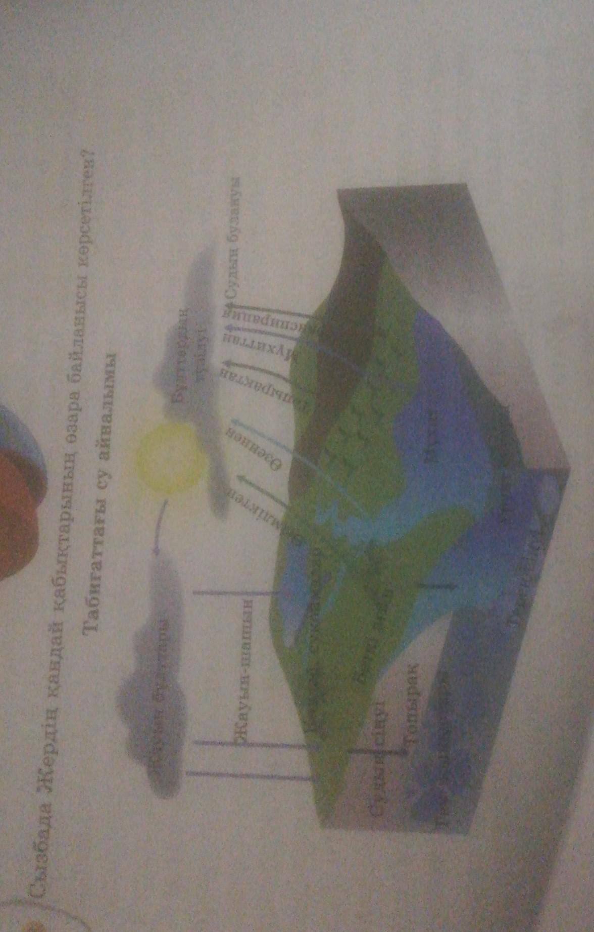 Диаграмма су айналымын көрсетеді. Бұл процесс былай жүреді: су бұлтқа буланады, содан кейін жаңбыр жауады. Содан кейін ол литосфера мен тропосфераға еніп, 50% жерге сіңеді, ал қалған 50% суға түседі.