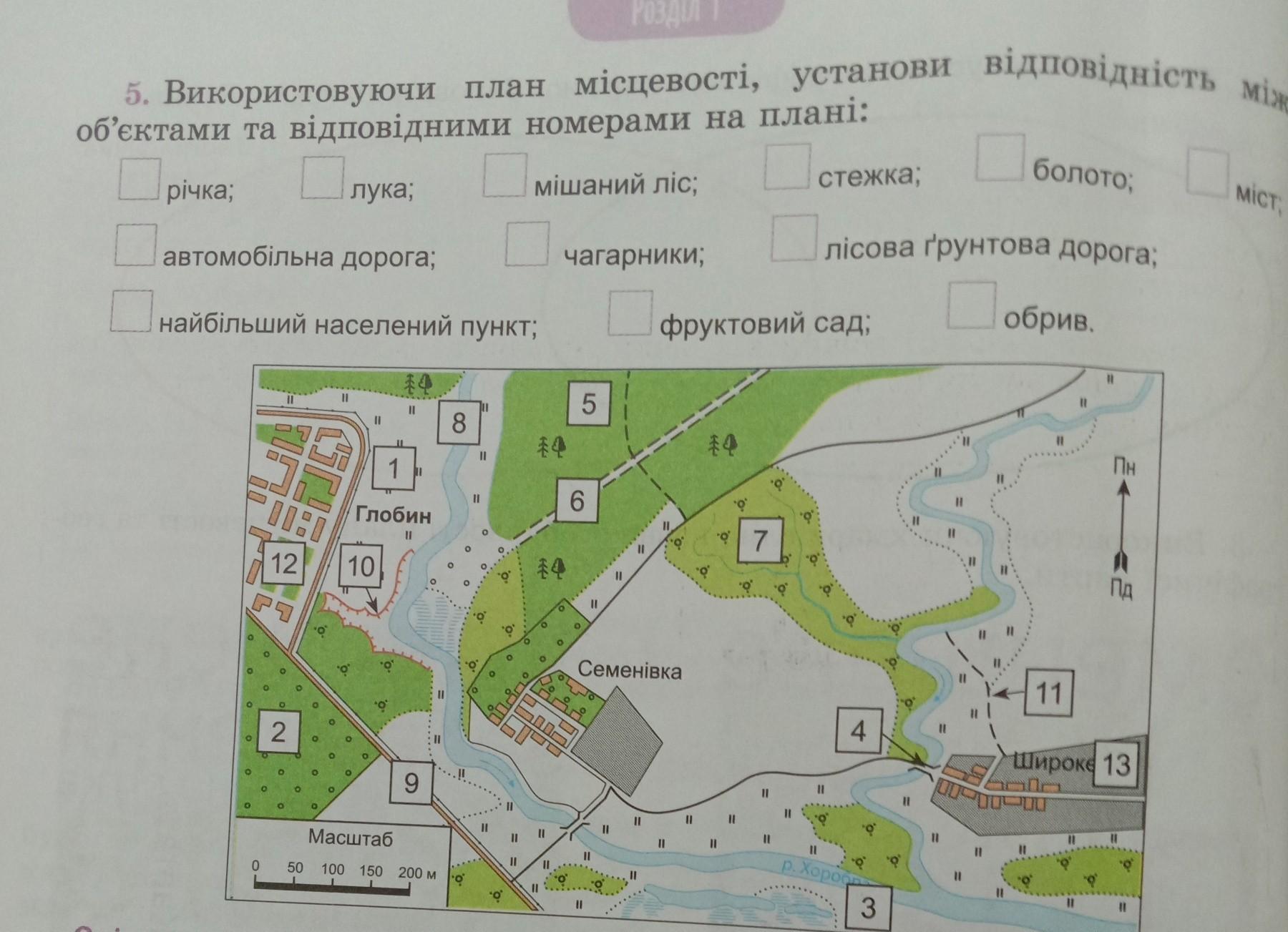 5. Використовуючи план місцевості, установи відповідність між болото; мішаний ліс; стежка; лісова ґрунтова дорога; річка; автомобільна дорога; найбiльший населений пункт.