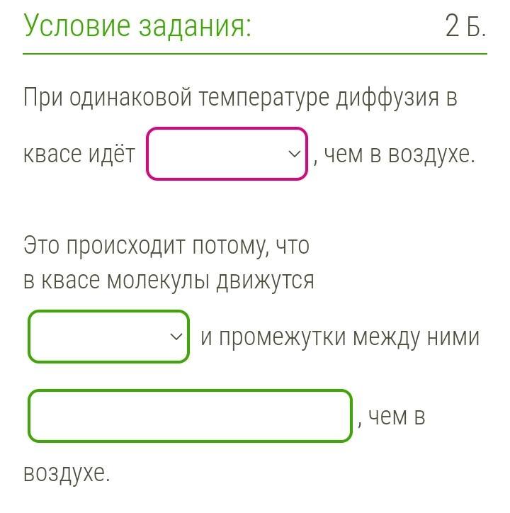 Ответ: При одинаковой температуре диффузия в квасе идёт медленее, чем в воздухе
