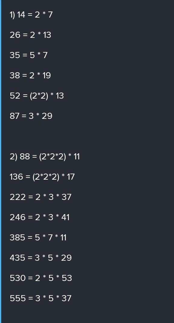 А 264. Разложите Ha простые составные числа (3) 396, 456, 504, 700, 594, 1170, 2310, 3100. 265. Образец: 390 2 195 3 655 13 13 1 390=2-3-5-13