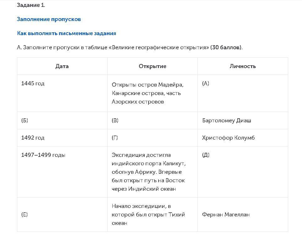 А. Заполните пропуски в таблице «Великие географические открытия» (30 баллов).