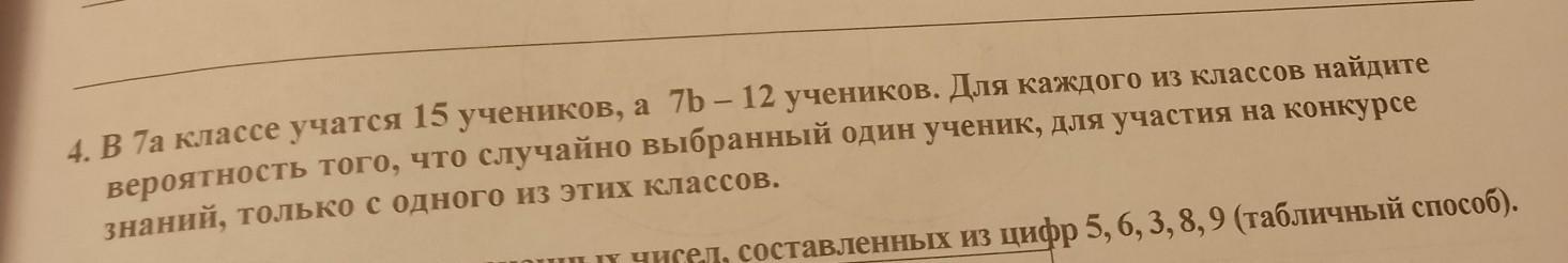 - 4. В 7а классе учатся 15 учеников, а 70 - 12 учеников. Для каждого из классов найдите вероятность того, что случайно выбранный один ученик, для участия на конкурсе знаний, только с одного из этих классов.