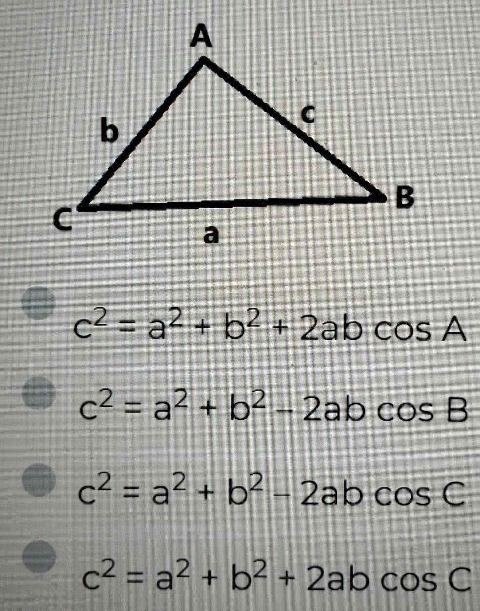 Объяснение: теорема косинусів: "Квадрат будь-якої сторони трикутника дорівнює сумі квадратів двох інших його сторін без подвоєного добутку цих сторін на косинус кута між ними".