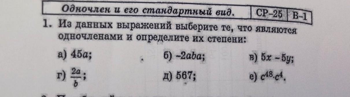Одночлен и его стандартный вид. CP-25 | B-1 1. Из данных выражений выберите те, что являются одночленами и определите их степени: a) 45а; 6) -2aba; д) 567; в) 5х - бу; e) c48.04.
