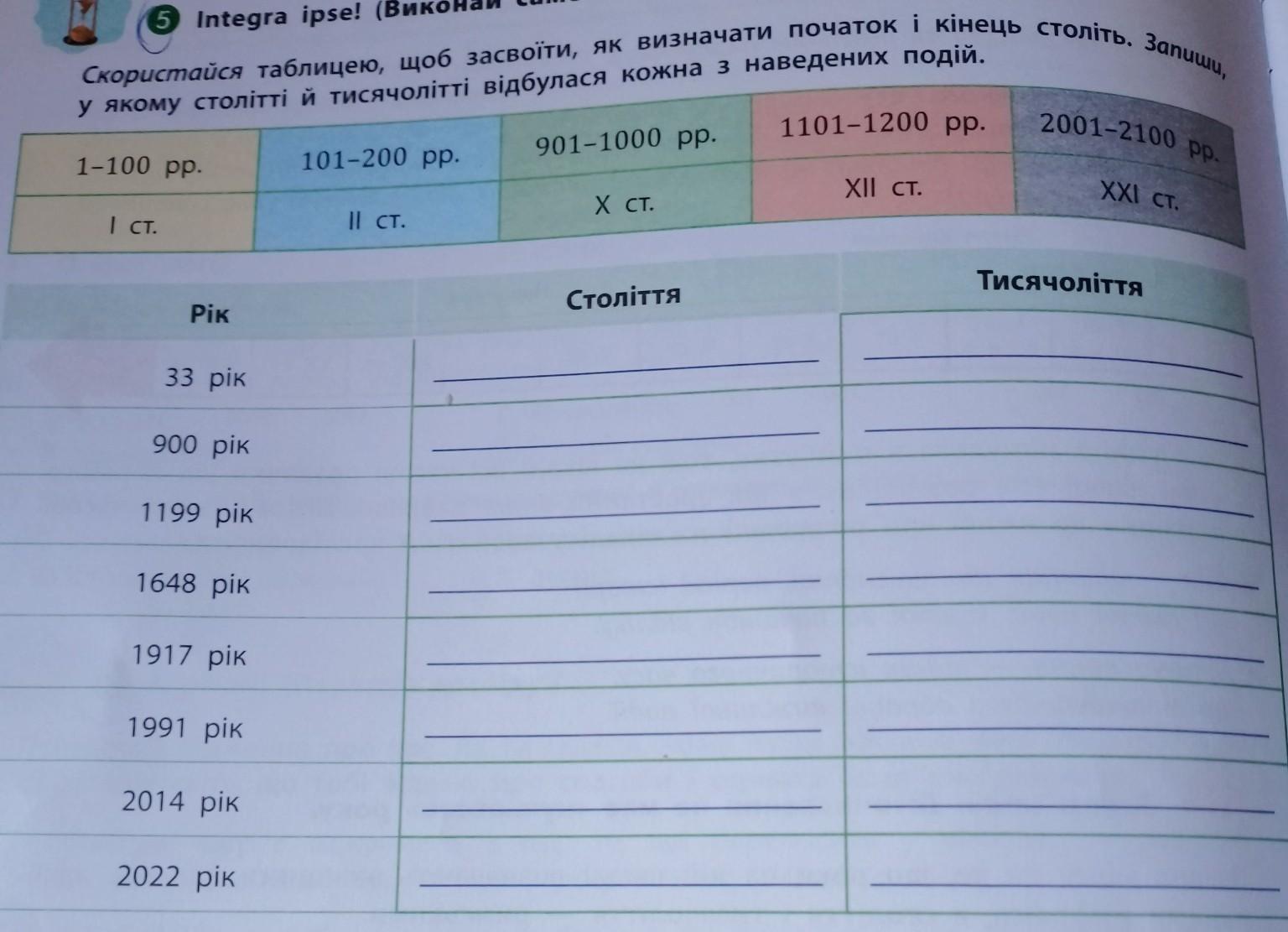 6 Integra ipse! (Виконай самостійно!) Скорисмо ся таблицею, щоб засвойти, як визначати початок і кінець столь У ЯКОМУ СТОЛІТТí и тисячолітті відбулася кожна з наведених подій. 1101-1200 Pо. 1-100 pp. Pix 33 pix 900 pik 1199 рiк 1648 pik 1917 pik 1991 pik 2014 pik 2022 pik 101-200 pp. 1 ст. 3- do an 901-1000 pp. X ст Століття XII ст. 2001-2100 pp. 000 et Тисячоліття