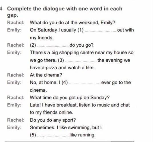 4 Complete the dialogue with one word in each gap. Rachel: Emily: What do you do at the weekend, Emily? On Saturday I usually (1) ...................with... my friends. Rachel: (2) ............do you go? Emily: There's a big shopping centre near my house so we go there. (3) have a pizza and watch a film. the evening we Rachel: Emily: At the cinema? No, at home. I (4) ever go to the cinema. Rachel: What time do you get up on Sunday? Late! I have breakfast, listen to music and chat to my friends online. Emily: Rachel: Do you do any sport? Emily: Sometimes . I like swimming, but I like running. (5) СРОЧНО НУЖНО ДО ЗАВТРА ДАМ 20 БАЛЛОВ