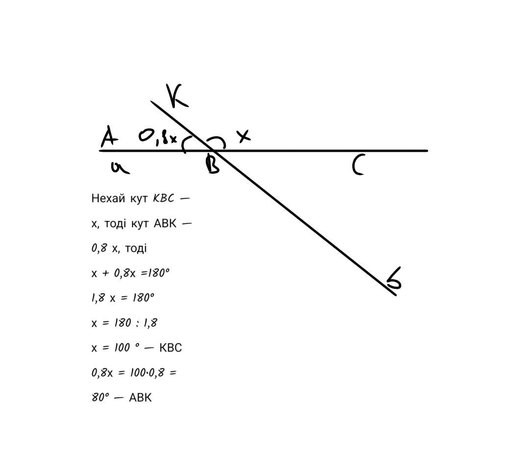 СРОЧНО!!!! ДАЮ 35 БАЛОВ!!! ПОМОГИТЕ ПОЖАЛУЙСТА!!! 3 .При перетині двох прямих утворилися кути, один з яких дорівнює 0,8 другого. Знайти ці кути . (введіть свої позначення кутів)