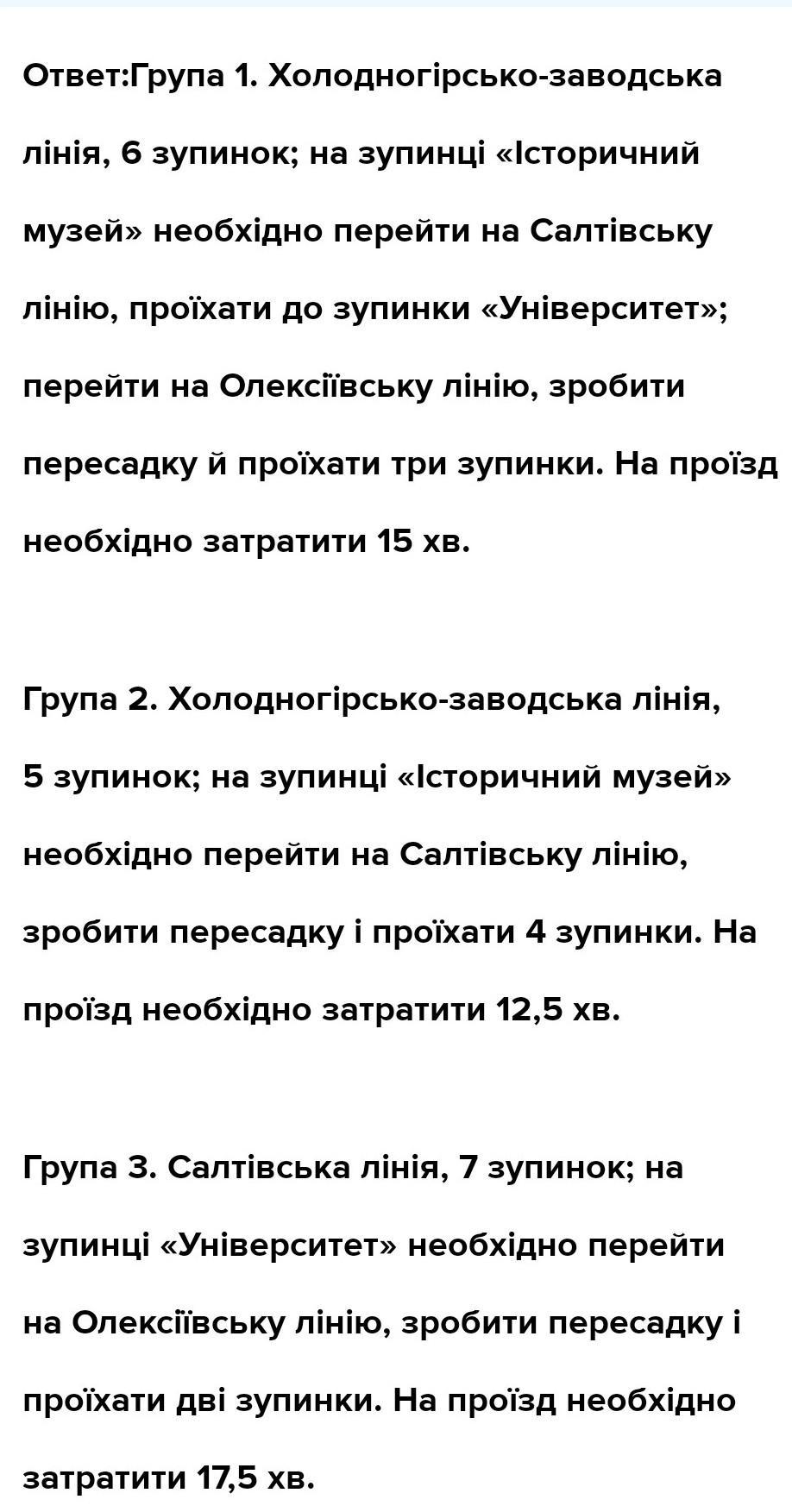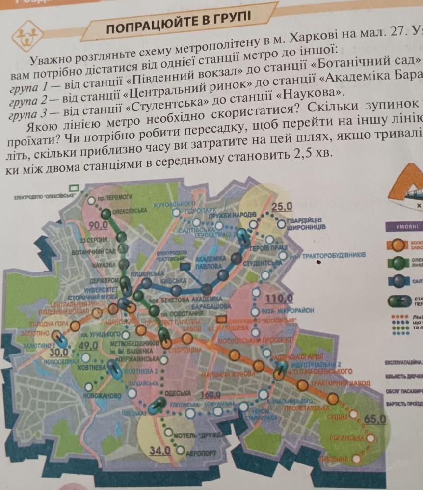 уважно розгляньте схему метрополітену в місті Харків на малюнку 27 уявіть що вам потрібно дістатися від однієї станції метро до іншої. група 1 - від станції "Південний вокзал" до станції" ботанічний сад". 2 - від "станції центральний ринок" до станції" академіка барабашова" група 3 від станції "студентська" до станції "наукова" якою лінією метро необхідно скористатися? скільки зупинок потрібно проїхати? чи потрібно робити пересадку щоб перейти на іншу лінію? обчисліть скільки приблизно часу ви витратите на цей шлях якщо тривалість поїздки між двома станціями в середньому становить 2,5 хвилини